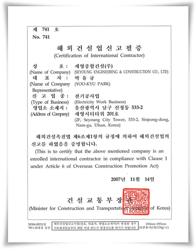 해외건설업 신고필증(전기공사업)