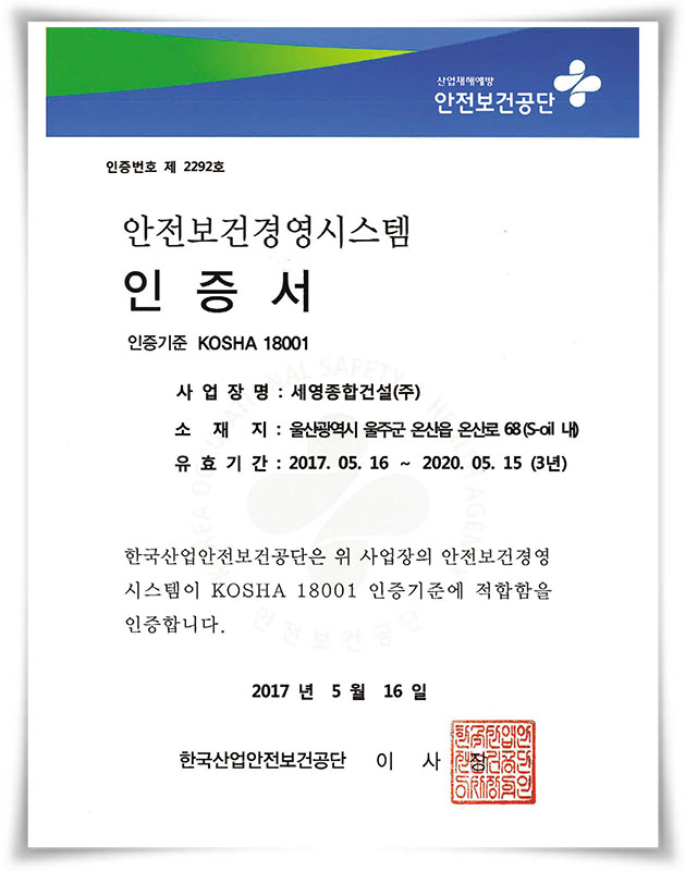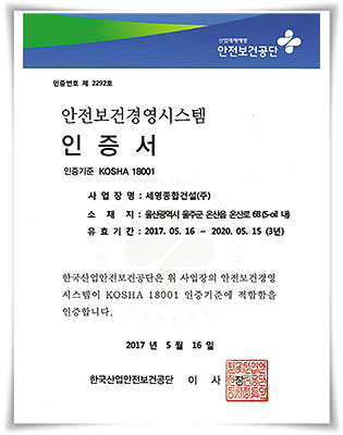안전보건경영시스템 인증서 KOSHA 18001