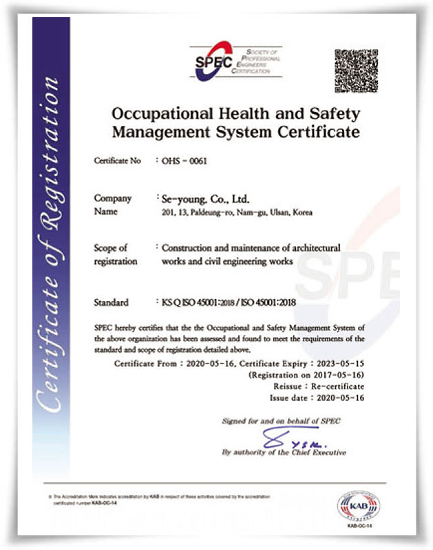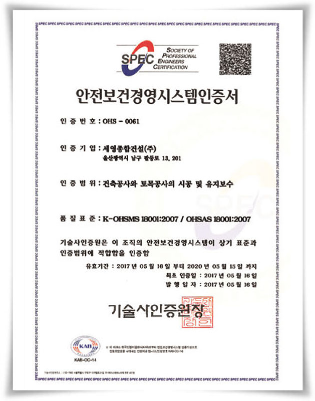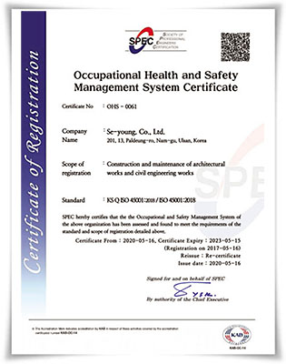 안전보건경영시스템 인증서 OHS-0061